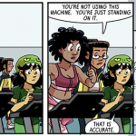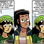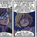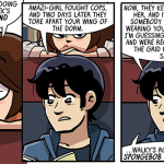 In today’s strip, she wears green and yellow, and you’ll notice that up above she’s in purples. See, at some point in the middle of drawing this storyline, I realized that I had too many characters who wore predominantly green. I am, like, a green fiend. Probably all those years of Shortpacked! getting to my brain. This green overabundance bothered me, but not enough to go back and recolor Dorothy differently, I guess. So, uh, hope you don’t like the greens, ‘cuz she wont’ be wearing them after this first “day” of strips. After that, it’s mostly purples for her. Ugh!