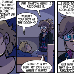 For 99% of you, Dorothy Keener is a new character. Her only appearances in the Old Continuity are in Joyce and Walky!, and almost entirely in the subscriber-only material. So don’t worry if you don’t know her. After all, you’re not “required” to, same as everyone else in Dumbing of Age. It’s a clean slate for everyone.