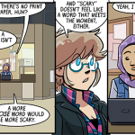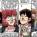 In today’s strip, she wears green and yellow, and you’ll notice that up above she’s in purples. See, at some point in the middle of drawing this storyline, I realized that I had too many characters who wore predominantly green. I am, like, a green fiend. Probably all those years of Shortpacked! getting to my brain. This green overabundance bothered me, but not enough to go back and recolor Dorothy differently, I guess. So, uh, hope you don’t like the greens, ‘cuz she wont’ be wearing them after this first “day” of strips. After that, it’s mostly purples for her. Ugh!