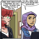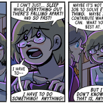 In today’s strip, she wears green and yellow, and you’ll notice that up above she’s in purples. See, at some point in the middle of drawing this storyline, I realized that I had too many characters who wore predominantly green. I am, like, a green fiend. Probably all those years of Shortpacked! getting to my brain. This green overabundance bothered me, but not enough to go back and recolor Dorothy differently, I guess. So, uh, hope you don’t like the greens, ‘cuz she wont’ be wearing them after this first “day” of strips. After that, it’s mostly purples for her. Ugh!