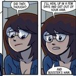 In today’s strip, she wears green and yellow, and you’ll notice that up above she’s in purples. See, at some point in the middle of drawing this storyline, I realized that I had too many characters who wore predominantly green. I am, like, a green fiend. Probably all those years of Shortpacked! getting to my brain. This green overabundance bothered me, but not enough to go back and recolor Dorothy differently, I guess. So, uh, hope you don’t like the greens, ‘cuz she wont’ be wearing them after this first “day” of strips. After that, it’s mostly purples for her. Ugh!