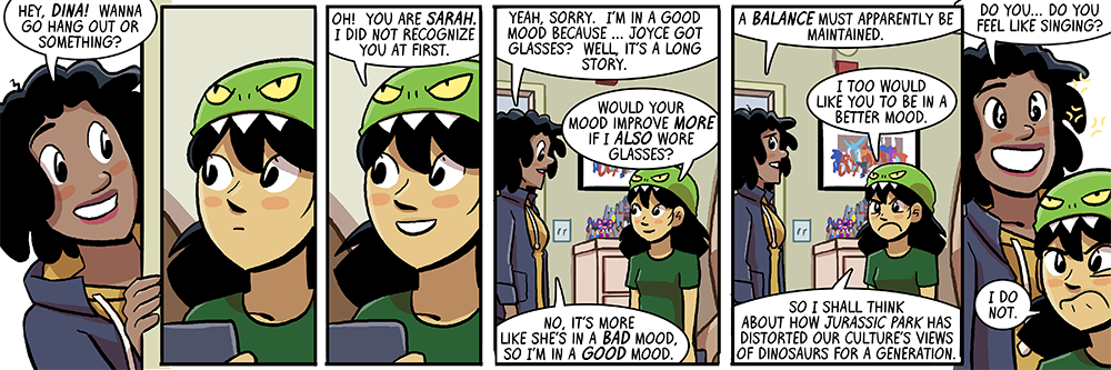? I am in a good mood, a really good mood. Joyce is wearing those glasses and Dina is hating Jurassics.