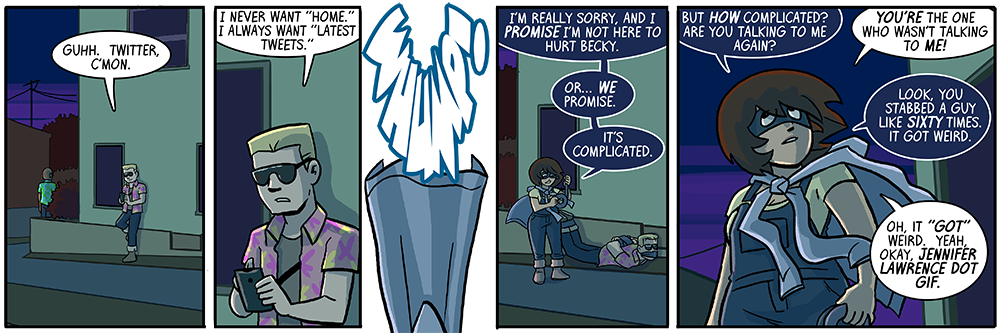 4. It’s still how this strip has always been. It’s always been a mix of realistic college problems and interspersed action movie stuff. It does cause some mood whiplash and always has.