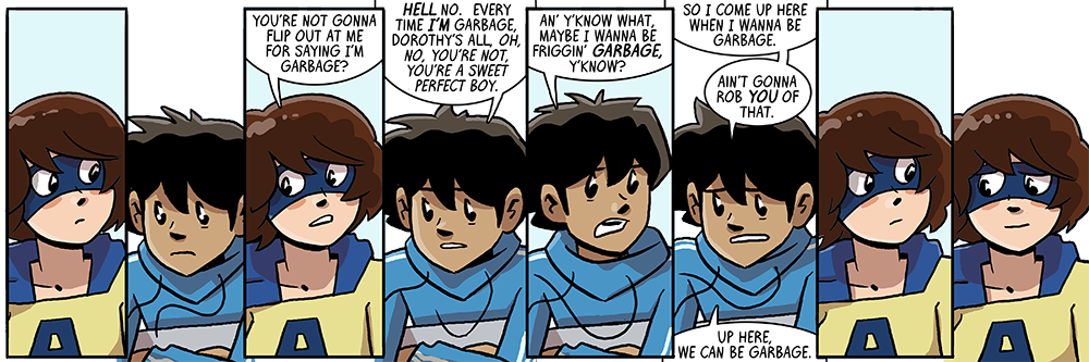 So, a compromise that I’ve found helps sometimes is someone saying, “I’m sorry you feel that way; I felt that about myself when [I failed a class / got dumped by friend / didn’t get into art school] and it *sucks*. I feel you.” So, it’s like, empathizing without saying “Yes, you are, in fact, garbage.” Actually, technically this is what Walky is doing; not judging or trying to fix it, just empathizing so Amber doesn’t feel alone.