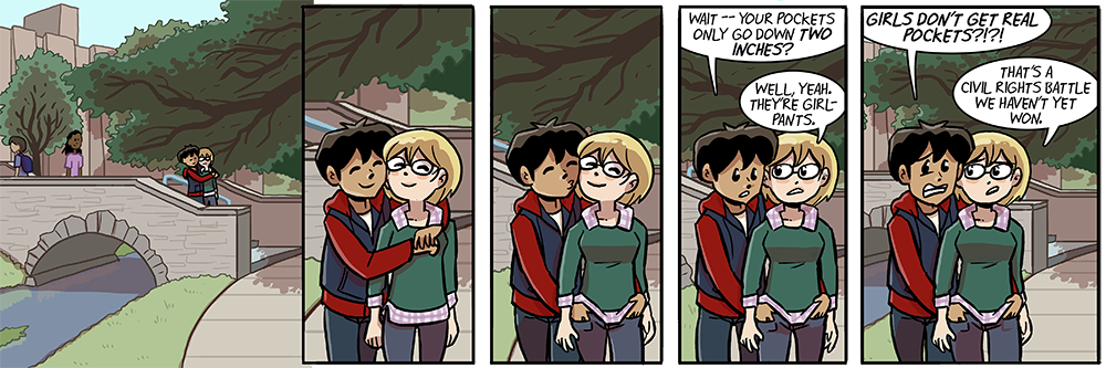 101. A civil rights battle not won due to improper tactics. I volunteer to not wear pants until this issue is resolved. It will be a sacrifice to give up having almost a hundred cubic inches of pocket space, but it is one I am willing to make! I presume the sight of me sans pants will be enough to turn the heart (if not stomach) of the most stubborn of fashion designers; but if others wish to join me, the more the merrier!