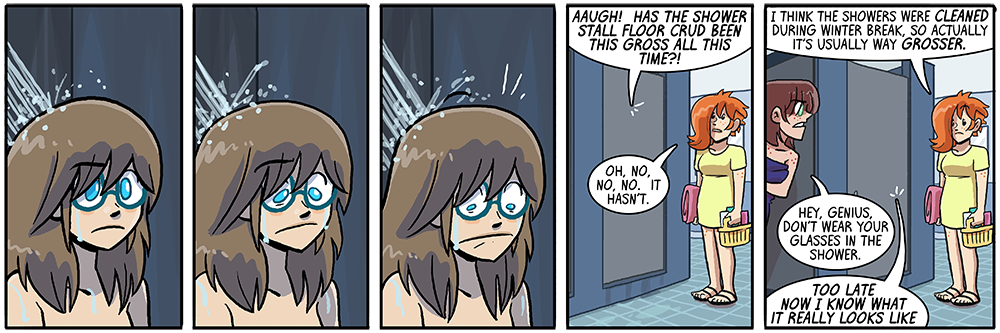 27. Shower floors being gross wasn’t even the main reason I didn’t wear my glasses when showering in college. The main reason I don’t wear glasses when showering is because water gets on them and you can’t see as well through water-covered glasses.