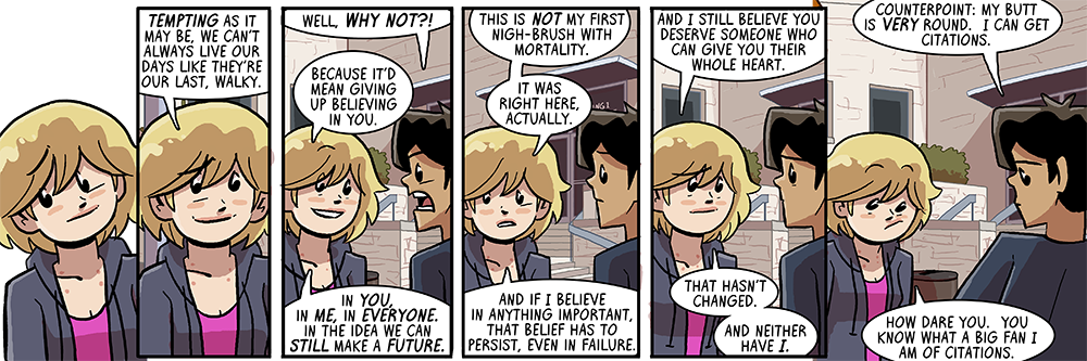 Frankly I don’t really think Dorky’s going to resail, at least not any time soon. Which, eh, fine. I think Walky needs to pull a Danny and NOT date for a little bit if/when the thing with Amber fizzles, and my concerns with Dorothy are settled so long as she has SOME regular social interactions. I do worry that after midterm results come out she’s going to throw herself into another crunch streak – pretty sure the reason she’s doing better now is because she finished that set of extra credit assignments she was working on. If her grades slip again, I don’t feel confident she WON’T fall back in that habit.