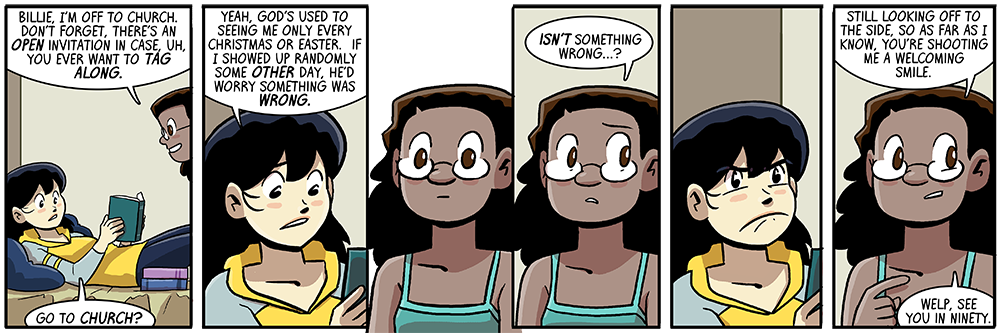 People talk about how unrealistic it is to have so many lgbt characters in one comic, but what about all these college-age practicing Christians? Where I go, you assume everyone is an atheist by default.