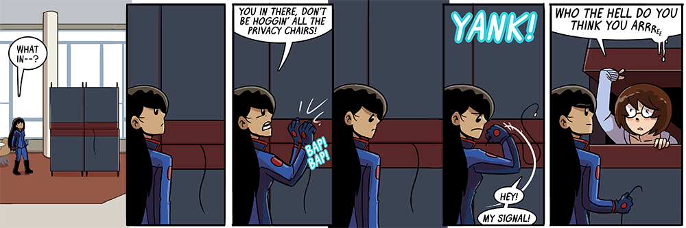She does tend to stick up for folks, though. Maybe there are nameless extras slouching uncomfortably offpanel, wistfully gazing at the Cube of Isolation.