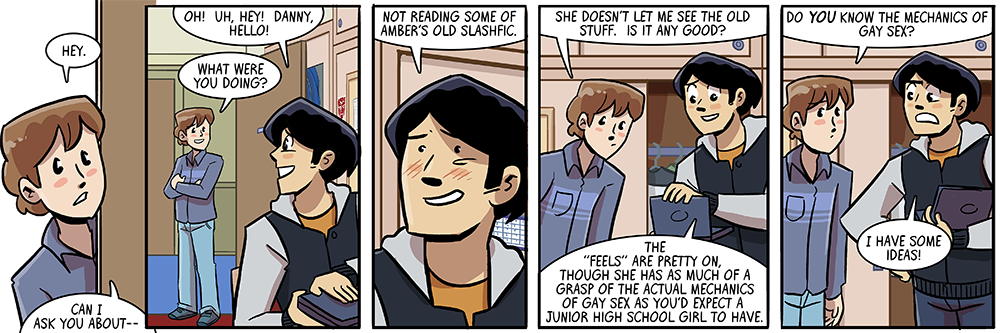3. Next panel is both of them on youporn going “ooooh, that’s how it works” then Ethan spots Danny has, ahem, some trouble standing up…