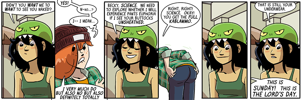 Although yeah Dina seems as if she’s being a little pushy, obviously without meaning to be, just not reading signals properly…which is understandable because this is a weird situation. Better communication from them both would be good so this doesn’t get uncomfortable. But I imagine that despite Becky’s weird mixed signals, the next comic is going to involve some form of Dina reminding Becky she doesn’t have to do anything she doesn’t want to, since Dina has been quite clear on that and I imagine she will continue to be clear on it, since she cares an awful lot in general about being clear in her communication and avoiding misunderstandings.