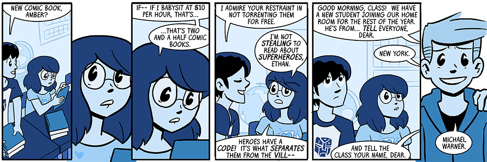 The character models for this arc’s flashback scenes look a lot younger than that. Maybe fourth or fifth grade? That’s when my school system introduced the concept of “homeroom” and changing rooms and teachers for a couple classes. (Sixth through eighth was middle school, which had a room change for every class.)