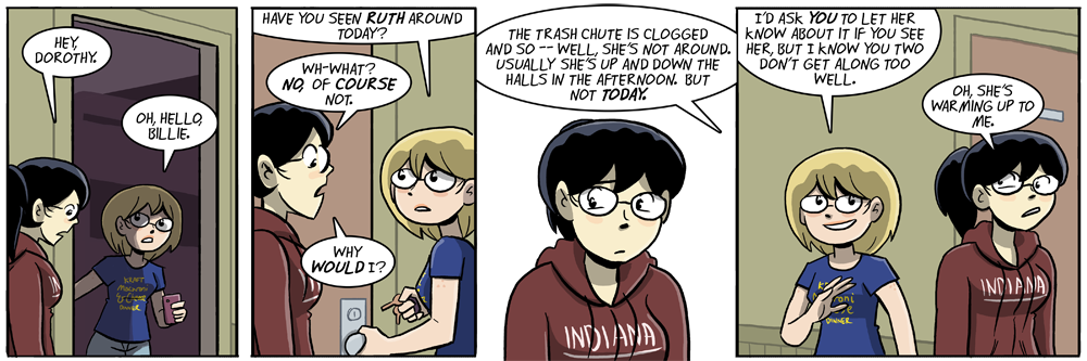 2. As I’m sure (okay, not SURE, because your comment suggested to me that you aren’t very observant, but I’m still fairly confident) you’ve already noticed, Billie is conflicted about her feelings for Ruth, just as Ruth is conflicted about her feelings for Billie. Also, Billie strikes me as the independent, take-care-of-business-oneself type. Perhaps she didn’t call the cops because she’s trying to figure out how she feels about it. Perhaps she feels bad for Ruth, and doesn’t want to get her kicked out of school. If you recall she has for a time been trying to get the school newspaper to do a story on how awful Ruth is, but we saw earlier that those efforts have (at least for the moment) ceased.