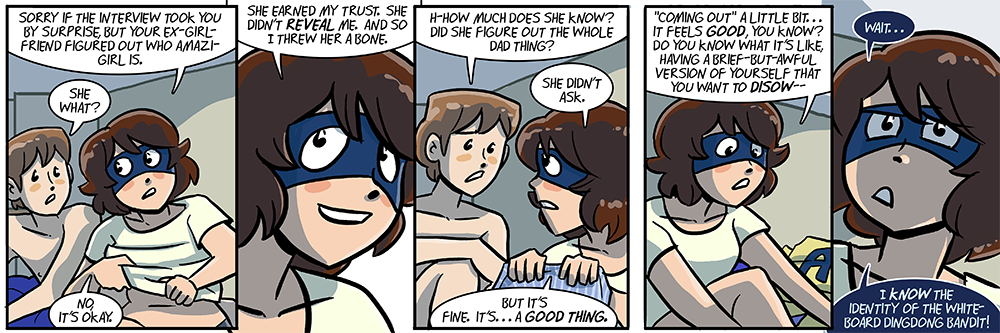 “Mask or No Mask,” a whopping sixteen pages of new smutty content, is now up on Slipshine for those who subscribe! (There are technically seventeen pages, but the final page is actually today’s comic reshuffled.) There is nakedness, parts touching, and a look into the psychology of Amber/Amazi-Girl. That’s right, the “mask” in the […]
