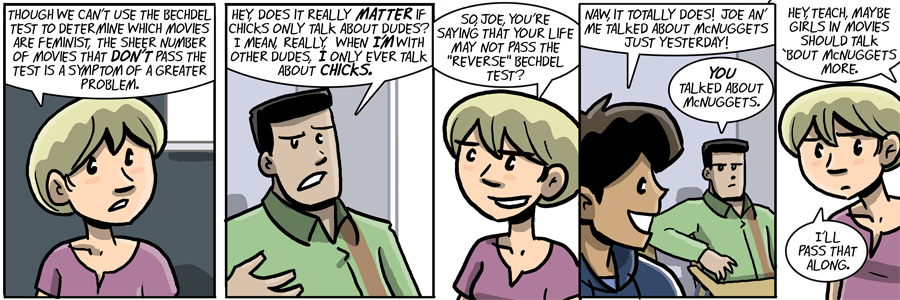 I should probably note at some point, since there was no room for it in the strip itself, that the “Bechdel Test” was popularized by Alison Bechdel’s comic strip Dykes to Watch Out For. Bechdel’s friend Liz Wallace actually came up with the test, but, uh, whoops! Sometimes names happen that way.
