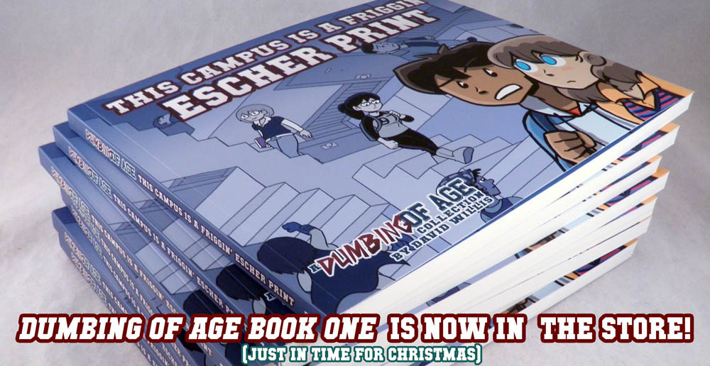 A week from Monday, on September 10, I will have been doing webcomics for fifteen years. Dumbing of Age will also be celebrating its second birthday! To celebrate this milestone, I have put together a limited poster! Suffice to say, it’s the busiest thing I have ever drawn in my life.
