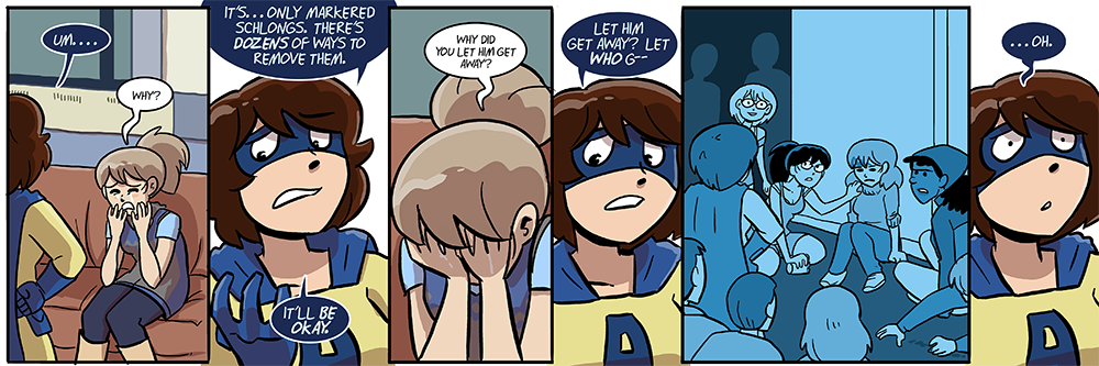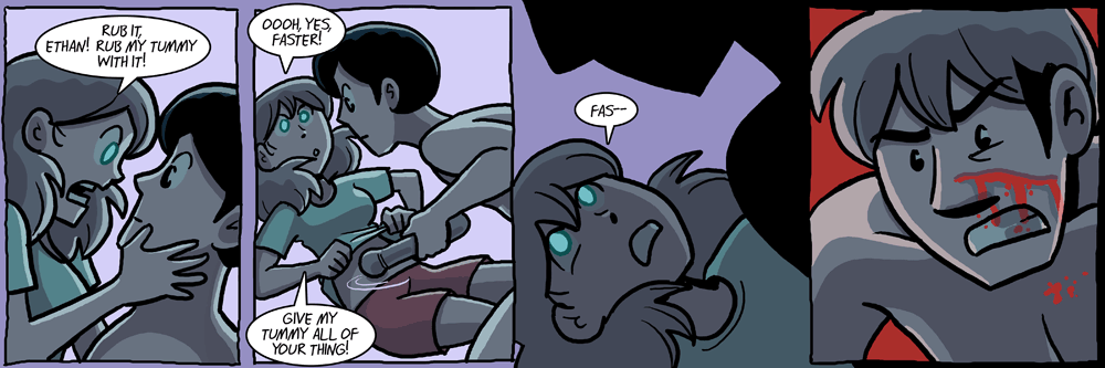I originally drew this strip to be more violent, but changed my mind and toned it down. However, after lots of discussion on Twitter, that original version is now what you see here. For more about the thought behind the change to and fro, check this Tumblr entry.