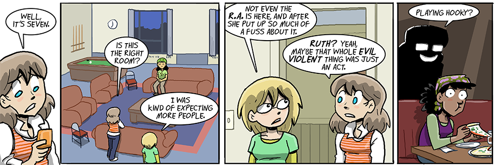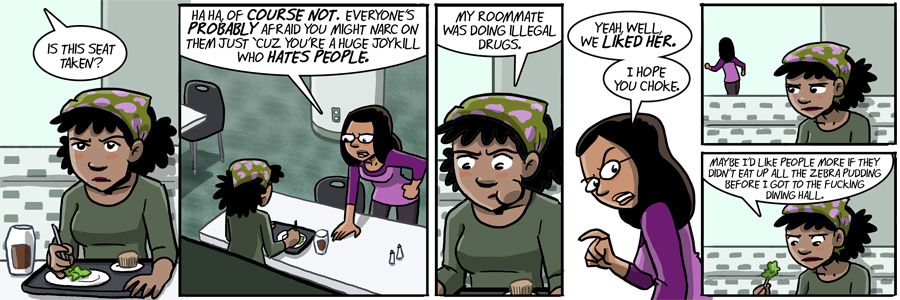 The Indiana University dinner hall depicted here actually stopped using trays as of October 1. I knew this before drawing the strip, but since the strip takes place in late August, I figgered I’d still draw them using trays. …forgetting, of course, that time doesn’t work the same way in Dumbing of Age as it […]