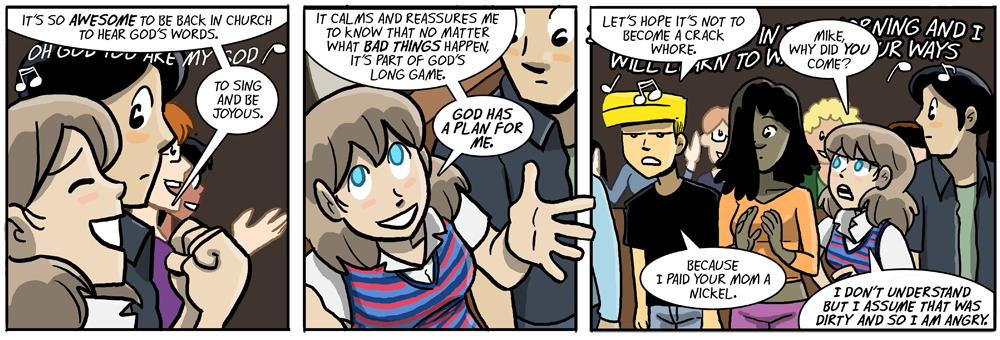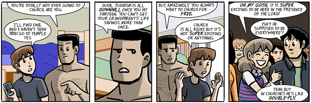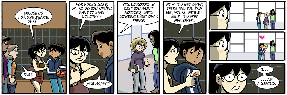 I will be at San Diego Comic-Con! I’ll have Dumbing of Age posters, pin-up postcards, and Shortpacked! books. If you’re in the webcomics area, I’m not far away!